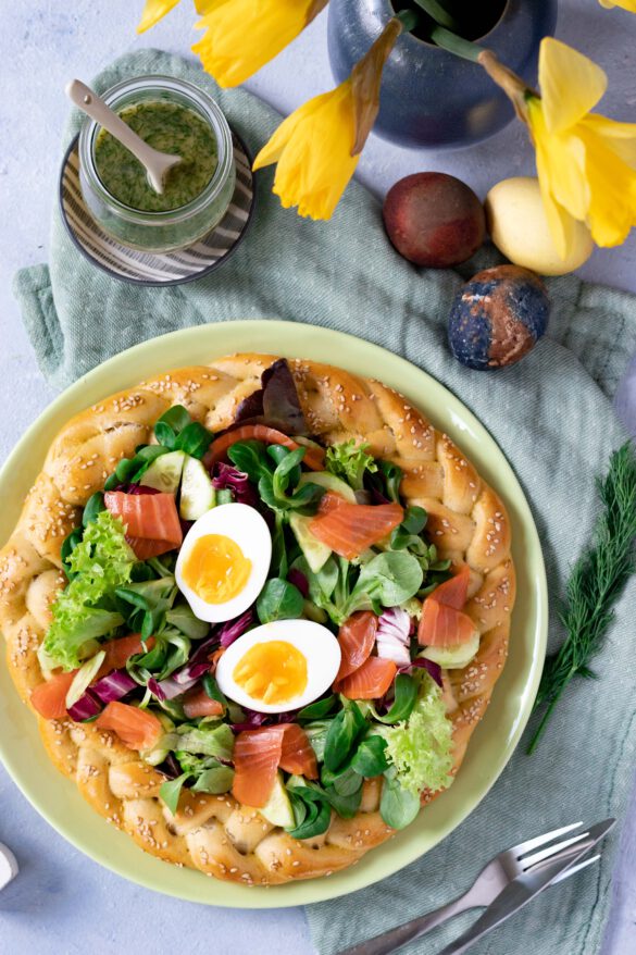 Dieses Jahr hab ich mich bewusst gegen ein süßes Osterrezept entschieden. Davon gibt es nun wirklich schon so einige. Zum Beispiel die fluffigen Quark-Öl-Häschen oder der Hasenkuchen aus meinem Kalender/eBook. Jetzt sollte es mal herzhaft werden. Deshalb gibt es einen herzhaften Osterkranz mit Salat, Räucherlachs, Ei und einem Senf-Dill-Dressing