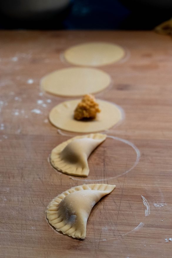 - Den Nudelteig mit einer Nudelmaschine oder einem Nudelholz dünn ausrollen. Kreise ausstechen und ca. 1 Teelöffel Masse in die Mitte des Kreises geben. Dann in der Mitte einmal zusammenklappen und die Ränder zusammendrücken. Sollten die Ränder zu trocken sein, diese ggf. mit etwas Wasser rundherum dünn einstreichen und dann falten. Mit einer Gabel die Ränder noch einmal gut zusammendrücken.